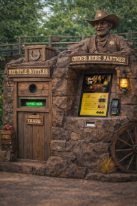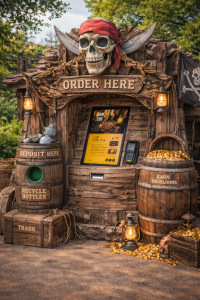 Denk aan een themastation dat perfect past bij een park, restaurant of speelomgeving. Zo verandert een simpele bestelzuil in een plek waar gasten niet alleen bestellen, maar ook iets beleven.